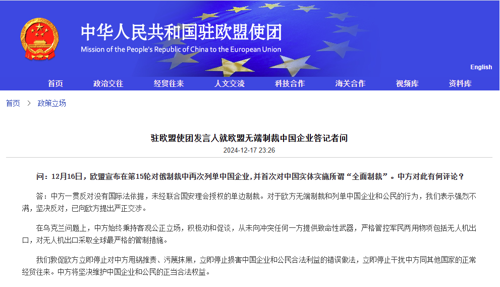 中國駐歐盟使團網站截圖 問:12月16日,歐盟宣布在第15輪對俄制裁中再次列單中國企業,并首次對中國實體實施所謂“全面制裁”。中方對此有何評論? 答:中方一貫反對沒有國際法依據,未經聯合國安理會授權的單邊制裁。對於歐方無端制裁和列單中國企業和公民的行為,我們表示強烈不滿,堅決反對,已向歐方提出嚴正交涉。 在烏克蘭問題上,中方始終秉持客觀公正立場,積極勸和促談,從未向衝突任何一方提供致命性武器,嚴格管控軍民兩用物項包括無人機出口,對無人機出口採取全球最嚴格的管制措施。 我們敦促歐方立即停止對中方甩鍋推責、污衊抹黑,立即停止損害中國企業和公民合法利益的錯誤做法,立即停止干擾中方同其他國家的正常經貿往來。中方將堅決維護中國企業和公民的正當合法權益。(完) 【編輯:丘志彬】