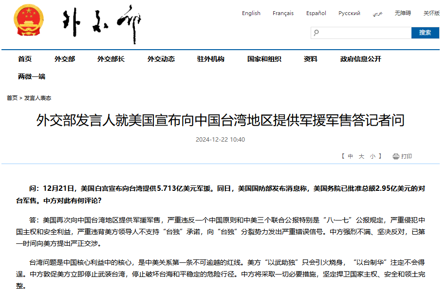 中國外交部網站截圖 有記者問,12月21日,美國白宮宣布向台灣提供5.713億美元軍援。同日,美國國防部發布消息稱,美國務院已批准總額2.95億美元的對台軍售。中方對此有何評論? 中國外交部發言人表示,中方強烈不滿、堅決反對,已第一時間向美方提出嚴正交涉。台灣問題是中國核心利益中的核心,是中美關係第一條不可逾越的紅線。美方“以武助獨”只會引火燒身,“以台制華”註定不會得逞。中方敦促美方立即停止武裝台灣,停止破壞台海和平穩定的危險行徑。中方將採取一切必要措施,堅定捍衛國家主權、安全和領土完整。(完) 【編輯:丘志彬】