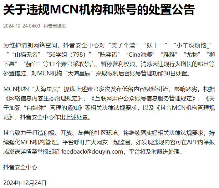 抖音官方頭條賬號“抖音黑板報”截圖 據《網絡信息內容生態治理規定》、《互聯網用戶公眾賬號信息服務管理規定》、《關於加強“自媒體”管理的通知》等相關法律法規要求,以及《抖音MCN機構管理規範》,對MCN機構“大海星辰”採取限制後台賬號管理功能30日處置。 上個月,吳柳芳的個人賬號“56學姐(798)”因在抖音賬號發布性感熱舞視頻,和中國奧運冠軍管晨辰的互懟引發熱議。之後,她的賬號一度被禁止關注,恢復之後瘋狂漲粉300多萬,但隨後陷入停滯當中,吳柳芳也再沒有更新視頻和進行直播。 目前吳柳芳的抖音賬號粉絲數僅剩4.4萬,而在本月初她的粉絲數超過了630萬。(完) 【編輯:丘志彬】
