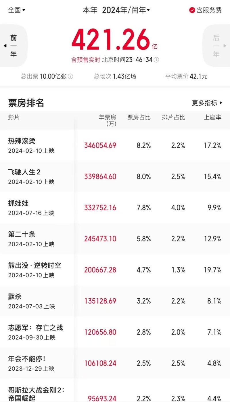 中國2024年觀影人次破10億 總票房421.26億