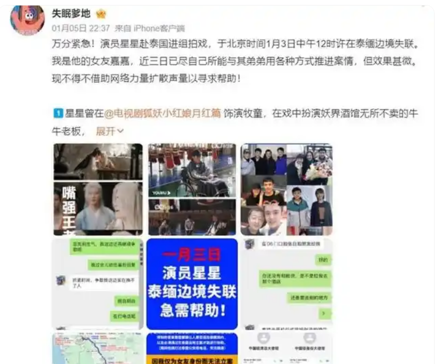 香港新聞網1月6日電 1月5日深夜,中國微博賬號“失眠爹地”發文,自稱“嘉嘉”,其男友“星星”是一名演員,日前赴泰國拍戲,在北京時間1月3日中午於泰緬邊境失聯,距離最後一次發消息已經超過60個小時。