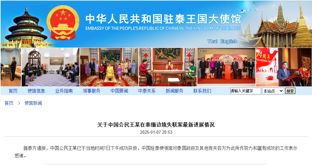 中國駐泰使館:泰方通報稱中國公民王某已成功獲救分享到: