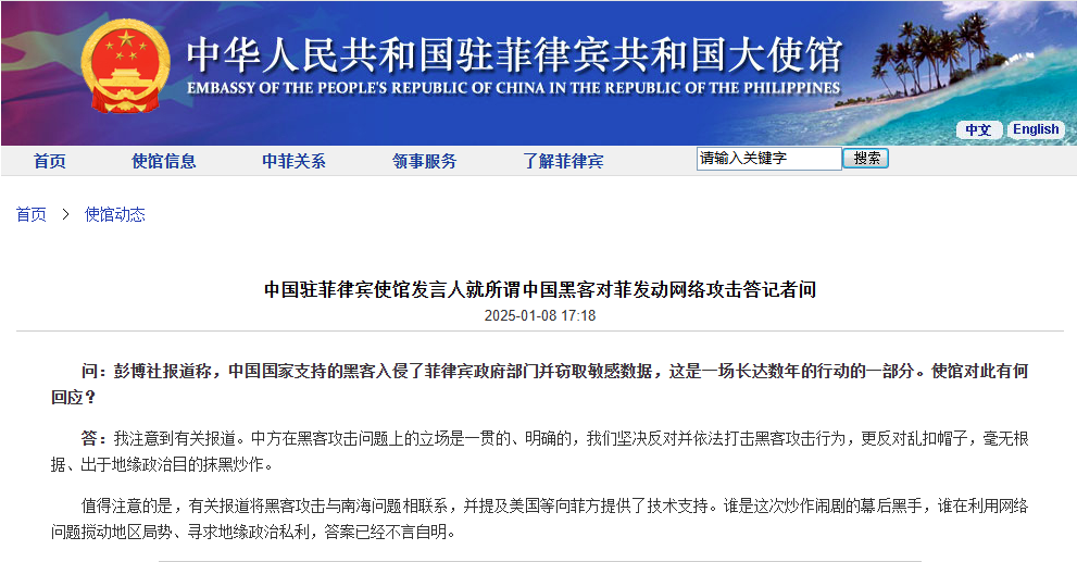 中國駐菲律賓大使館官網截圖 問:彭博社報道稱,中國國家支持的黑客入侵了菲律賓政府部門并竊取敏感數據,這是一場長達數年的行動的一部分。使館對此有何回應? 答:我注意到有關報道。中方在黑客攻擊問題上的立場是一貫的、明確的,我們堅決反對并依法打擊黑客攻擊行為,更反對亂扣帽子,毫無根據、出於地緣政治目的抹黑炒作。 值得注意的是,有關報道將黑客攻擊與南海問題相聯繫,并提及美國等向菲方提供了技術支持。誰是這次炒作鬧劇的幕後黑手,誰在利用網絡問題攪動地區局勢、尋求地緣政治私利,答案已經不言自明。(完) 【編輯:丘志彬】