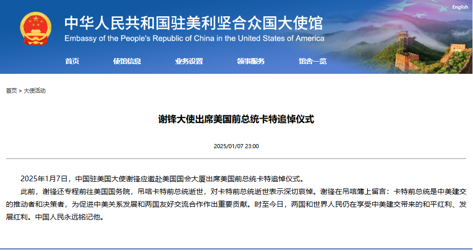 香港新聞網1月9日電 1月7日,中國駐美國大使謝鋒應邀赴美國國會大廈出席美國前總統卡特追悼儀式。