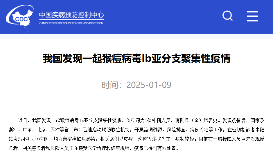 中國疾控中心網站截圖 發現疫情後,國家及浙江、廣東、北京、天津等省(市)迅速啟動聯防聯控機制,開展流調溯源、風險排查、病例診治等工作,在密切接觸者中陸續發現4例關聯病例,均為親密接觸後感染。相關病例以皮疹、疱疹等症狀為主,症狀較輕。 目前在一般接觸人員中未發現感染者,相關感染者和風險人員正在接受醫學治療和健康觀察,疫情已得到有效處置。 目前猴痘病毒有分支Ⅰ和分支Ⅱ兩個分支,兩個分支又分為Ⅰa、Ⅰb和Ⅱa、Ⅱb亞分支。既往猴痘疫情主要在非洲地區流行,2022年5月,Ⅱb亞分支在歐洲、美洲和亞洲等多個既往非流行國家和地區暴發。 猴痘病毒Ⅰb亞分支是2023年9月在剛果(金)的南基伍省首次發現,自2024年7月開始,猴痘病毒Ⅰb亞分支從剛果(金)逐步向周邊國家擴散,造成持續性社區傳播,並通過國際旅行逐步輸入至非洲其他國家及非洲以外的國家和地區。2024年8月14日,世界衛生組織再次宣布猴痘疫情為“國際關注的突發公共衛生事件”。(完) 【編輯:丘志彬】