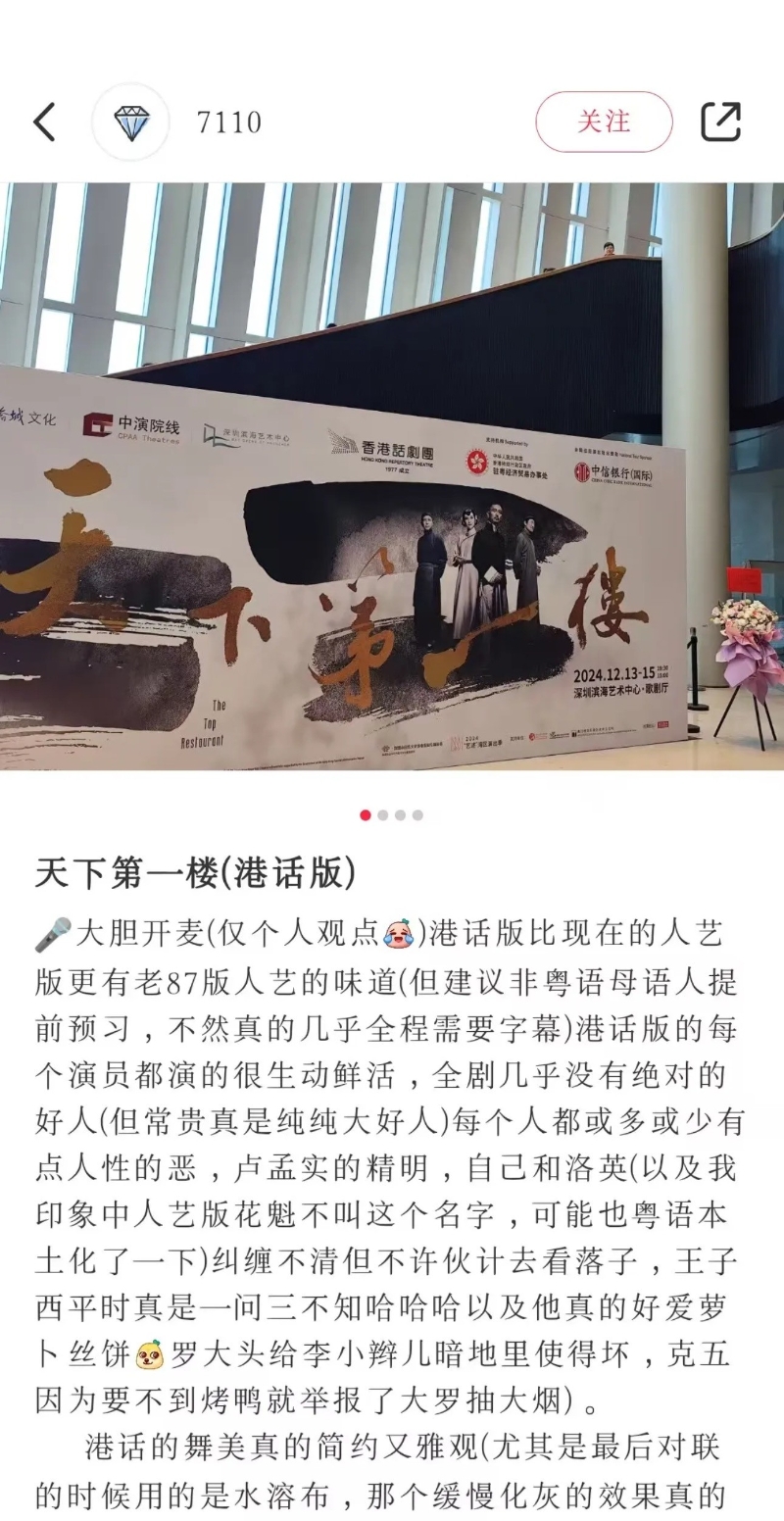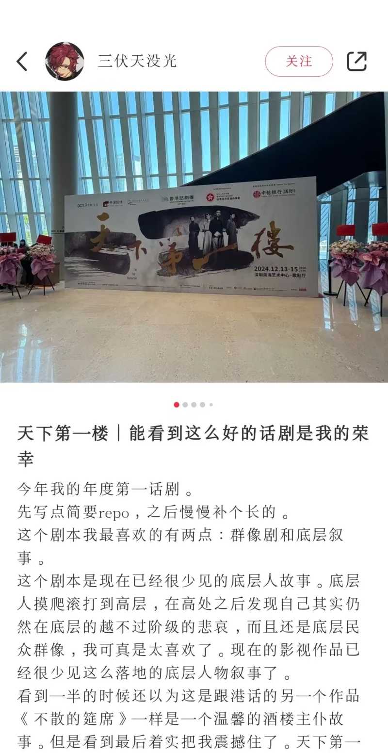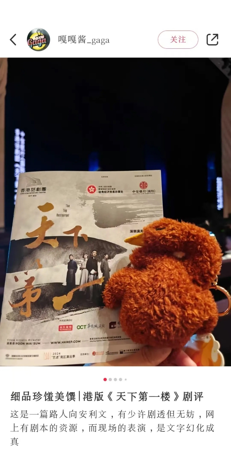 直擊爆款口碑 口碑&深度repo刷屏! 在保留了原劇本的全部台詞的基礎之上,香港話劇團《天下第一樓》在舞美、調度、表演等多個方面呈現出獨特的現代感——導演司徒慧焯在歷史與現代、經典與創新之間找到了平衡,提取經典文本中的核心主旨,與當下時代的精神取得共鳴,使觀眾產生興趣,與現代人的時代背景、生活等產生關聯。每場演出均收獲超高口碑,社交平台上深度觀後感、“自來水”不斷!