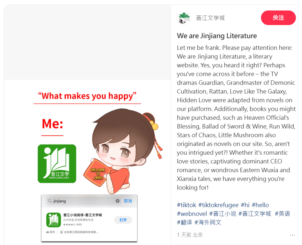香港新聞網1月17日電 繼中美網友自發在小紅書交收“貓稅”、輔導作業、交換表情包後,內地各大機構也開始下場“整活”,歡迎這些自稱“TikTok難民”的外國新用戶。 昨日(16日),內地原創網絡文學網站“晉江文學城”在內地社交媒體小紅書發帖介紹自己並歡迎外國網友。 帖文用英文介紹稱,一些在國外受到歡迎的電視劇如《鎮魂》、《陳情令》、《司藤》、《星漢燦爛》、《偷偷藏不住》等,都是“晉江文學城”的小說改編而來。一些國外網友購買過的出版作品,也是其網站的小說。晉江文學城表示,網站擁有浪漫的愛情小說、迷人的霸總文學、奇妙的東方武俠仙俠故事,“所以你還不心動嗎?”