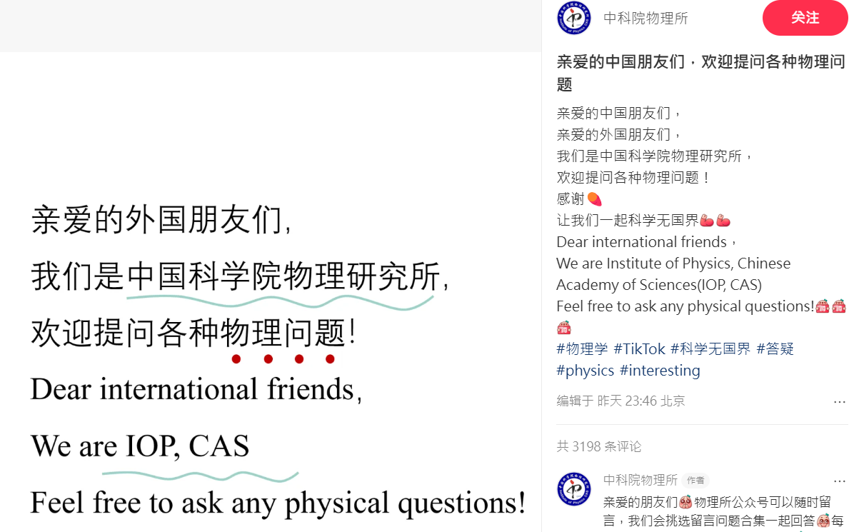 同日,中國科學院物理研究所也在小紅書上發帖,歡迎中外網友提問各類物理問題。帖文表示,讓我們一起科學無國界。