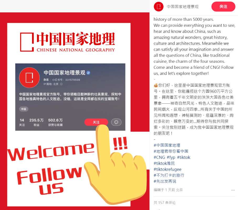 中國國家地理景觀亦發文歡迎來自國外的新朋友,稱在這裡外國網友將看到中國各色壯美景象——神奇自然風光、特色人文勝跡、品位民間煙火、縱觀山河四季……