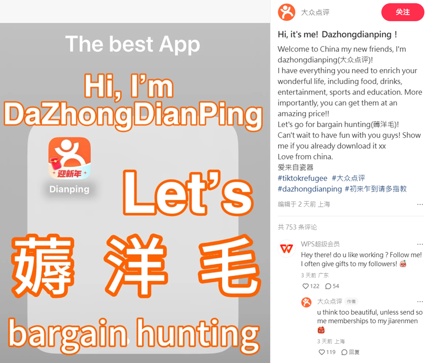 更早時間,內地各類應用軟件也紛紛發英文帖文攬客,涉及美食、消費、辦公等諸多類別。 內地美食消費平台大眾點評發文,呼籲外國網友一起加入“薅羊毛”。大眾點評在帖文中用英文介紹,我們擁有豐富生活的一切東西,包括食物、飲品、娛樂、運動和教育。“更重要的是,你能以非常驚喜的價格得到!” 之後,大眾點評還發布新帖文玩起“貓稅”梗,呼籲外國網友在評論區分享其萌寵或是家鄉美食。