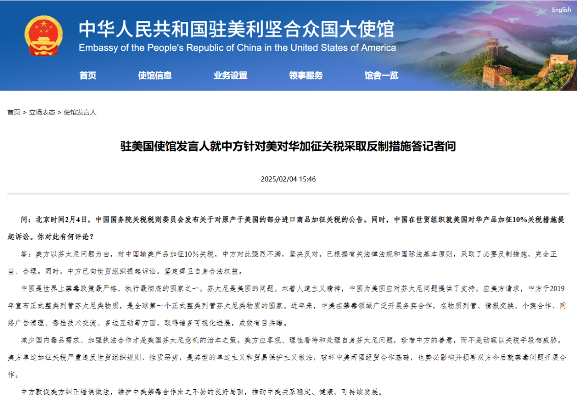 中國駐美國大使館網站截圖 問:北京時間2月4日,中國國務院關稅稅則委員會發佈關於對原產於美國的部分進口商品加征關稅的公告。同時,中國在世貿組織就美國對華產品加征10%關稅措施提起訴訟。你對此有何評論? 答:美方以芬太尼問題為由,對中國輸美產品加征10%關稅,中方對此強烈不滿,堅決反對,已根據有關法律法規和國際法基本原則,採取了必要反制措施,完全正當、合理。同時,中方已向世貿組織提起訴訟,堅定捍衛自身合法權益。 中國是世界上禁毒政策最嚴格、執行最徹底的國家之一。芬太尼是美國的問題。本著人道主義精神,中國為美國應對芬太尼問題提供了支持。應美方請求,中方於2019年宣布正式整類列管芬太尼類物質,是全球第一個正式整類列管芬太尼類物質的國家。近年來,中美在禁毒領域廣泛開展務實合作,在物質列管、情報交換、個案合作、網絡廣告清理、毒檢技術交流、多邊互動等方面,取得諸多可視化進展,成效有目共睹。 減少國內毒品需求、加強執法合作才是美國芬太尼危機的治本之策。美方應客觀、理性看待和處理自身芬太尼問題,珍惜中方的善意,而不是動輒以關稅手段相威脅。美方單邊加征關稅嚴重違反世貿組織規則,性質惡劣,是典型的單邊主義和貿易保護主義做法,破壞中美兩國經貿合作基礎,也勢必影響并損害雙方今後就禁毒問題開展合作。 中方敦促美方糾正錯誤做法,維護中美禁毒合作來之不易的良好局面,推動中美關係穩定、健康、可持續發展。(完) 【編輯:丘志彬】