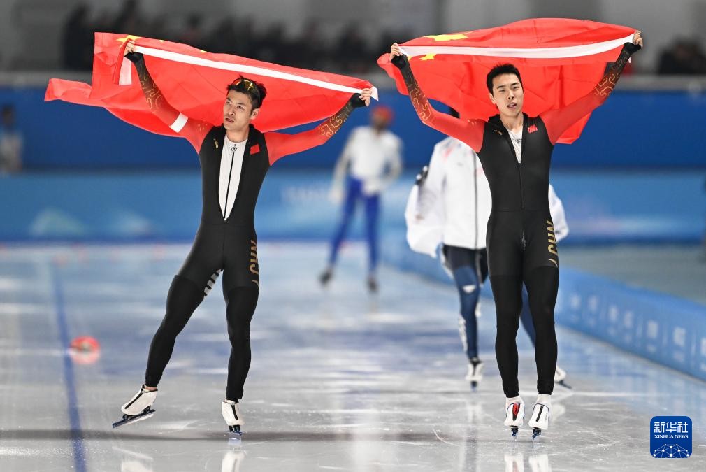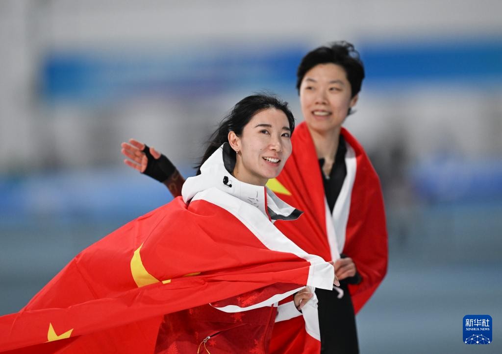 2月11日,寧忠岩(左)、廉子文賽後慶祝。新華社記者 陳振海 攝 哈爾濱亞冬會速度滑冰女子1000米決賽,中國選手韓梅奪得金牌,殷琦獲得銀牌。