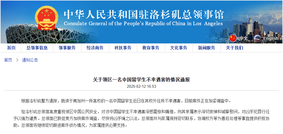 香港中通社2月13日電 中國駐洛杉磯總領事館13日通報:根據洛杉磯警方通報,就讀於南加州一所高校的一名中國留學生近日在其校外住所不幸遇害,目前案件正在加緊調查中。 中國駐洛杉磯總領館表示,高度重視領區中國公民安全,對該中國留學生不幸遇害深感震驚和痛惜,向其親屬表示深切哀悼和誠摯慰問,對兇手犯罪行徑予以強烈譴責。總領館已敦促美方加快案件調查,盡快將兇手繩之以法。總領館並與家屬保持密切聯繫,協調校方等為善後處理等事宜提供積極協助。總領館將繼續密切跟進案件偵辦情況,為家屬提供必要支持。