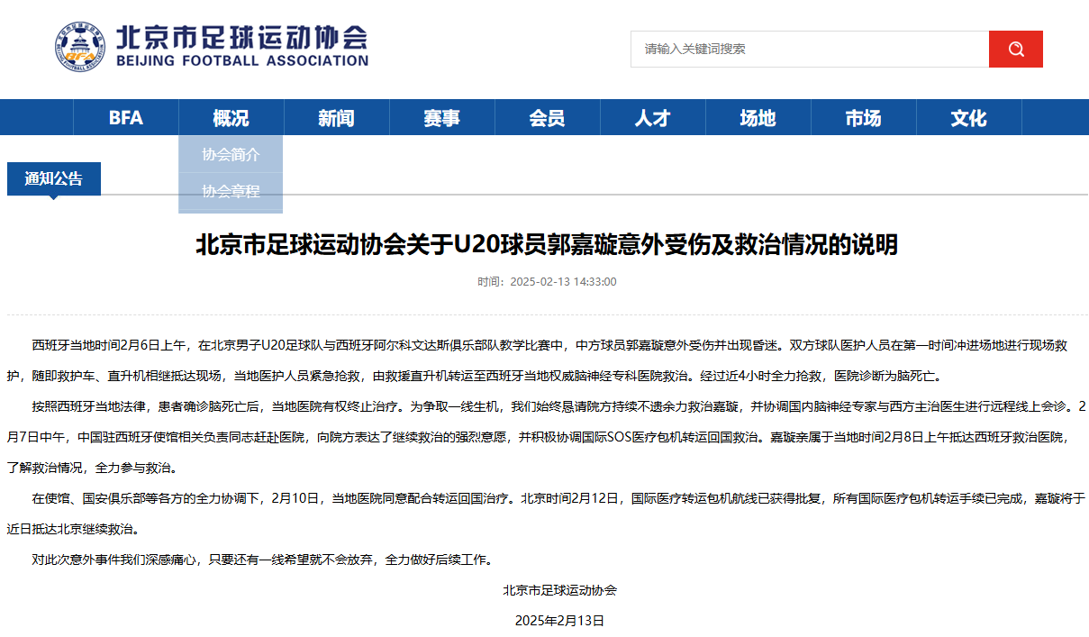 圖片來源:“北京市足球運動協會”官網截圖 北京市足球運動協會13日通報,西班牙當地時間6日上午,在北京男子U20足球隊與西班牙阿爾科文達斯俱樂部隊教學比賽中,中方球員郭嘉璇意外受傷並出現昏迷。雙方球隊醫護人員在第一時間衝進場地進行現場救護,隨即救護車、直升機相繼抵達現場,當地醫護人員緊急搶救,由救援直升機轉運至西班牙當地權威腦神經專科醫院救治。經過近4小時全力搶救,醫院診斷為腦死亡。 按照西班牙當地法律,患者確診腦死亡後,當地醫院有權終止治療。中方始終懇請院方持續不遺餘力救治郭嘉璇,並協調中國國內腦神經專家與西方主治醫生進行遠程線上會診。7日中午,中國駐西班牙使館相關負責人趕赴醫院,向院方表達了繼續救治的強烈意願,並積極協調國際S0S醫療包機轉運回國救治。郭嘉璇親屬於當地時間8日上午抵達西班牙救治醫院,了解救治情況,全力參與救治。 在中使館、北京國安足球俱樂部等各方的全力協調下,10日,西班牙當地醫院同意配合轉運回國治療。北京時間12日,國際醫療轉運包機航線已獲得批覆,所有國際醫療包機轉運手續已完成,郭嘉璇將於近日抵達北京繼續救治。 公開信息顯示,郭嘉璇生於2006年3月,2023年入選中國U17國家男子足球隊第二期集訓名單。2023年6月,他成功入選拜仁世界隊名單,是本屆唯一入選的中國球員。(完) 【編輯:林曉惠】