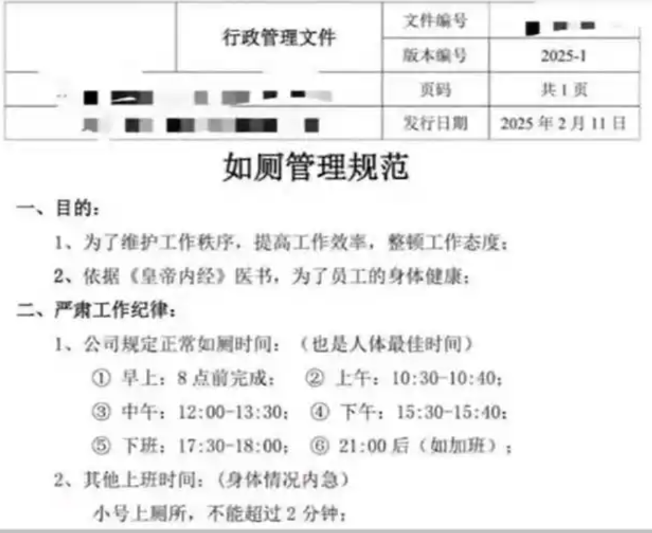 一公司發布《如厠管理規範》 圖:羊城晚报 《羊城晚報》引述該文件規定了公司員工如厠時間和不允許如厠時間,例如,10:30至10:40期間員工可正常如厠,11:30至12:00期間則不允許如厠。而在未規定的其他上班時間“小號上厠所”,則不能超過2分鐘。 該文件還規定:“如有特殊情況身體體質的找人力資源申請,無薪如厠,備案。” 此外,該文件還公佈了違規處理措施:“公司將通過監控隨時調取,對於違反規定的員工,將視情節輕重給予相應處理。違規將進行100元(人民幣)罰款(從當月工資扣減)。”值得注意的是,該文件還稱,此管理規範依據《黃帝內經》,發布的目的是保障員工的身體健康。 報道稱,媒體查證核實了該文件的真確性。據工作人員解釋,發布這一管理規範,是為了“告訴員工在哪個時間(如厠),沒有說控制的”,目前尚無員工對此有所反饋。 有律師表示,中國內地《勞動合同法》第4條規定,用人單位在制定、修改或決定有關勞動報酬、工作時間、休息休假、勞動安全衛生等重大事項時,應當經職工代表大會或全體職工討論,提出方案和意見,與工會或職工代表平等協商確定;據《勞動合同法》第32條則規定,勞動者對危害生命安全和身體健康的勞動條件,有權對用人單位提出批評、檢舉和控告。(完) 【編輯:葉永成】