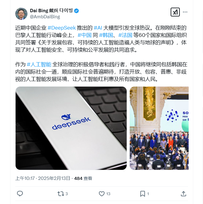 社交平台X截圖 當地時間13日戴兵在X平台寫道,近期中國企業DeepSeek推出的AI大模型引發全球熱議。在剛剛結束的巴黎人工智能行動峰會上,中國同韓國、法國等60個國家和國際組織共同簽署《關於發展包容、可持續的人工智能造福人類與地球的聲明》,體現了對人工智能安全、可持續和公平發展的共同追求。 戴兵說,作為人工智能全球治理的積極倡導者和踐行者,中國將繼續同包括韓國在內的國際社會一道,順應國際社會普遍期待,打造開放、包容、普惠、非歧視的人工智能發展環境,讓人工智能紅利惠及所有國家和人民。 韓國工業部2月5日宣布,出於“安全隱患”等考慮,已暫時禁止員工使用DeepSeek。其後,韓國外交部、國防部、產業通商資源部、韓國首爾大學也相繼屏蔽DeepSeek。 分析認為,戴兵強調“打造包容、非歧視AI發展環境”和“讓人工智能紅利惠及所有國家”或意指類似屏蔽措施不當。(完) 【編輯:丘志彬】