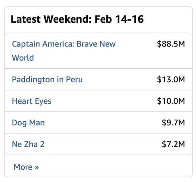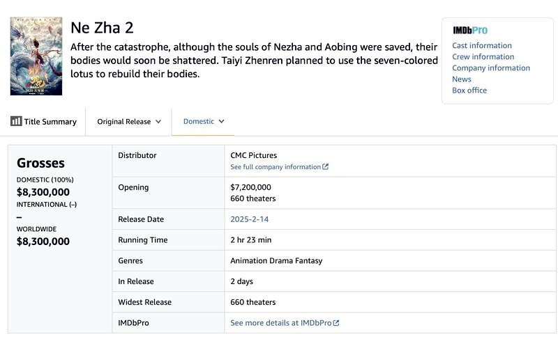 據Box Office Mojo數據顯示:《哪吒2》周票房約720萬美元,榮獲北美票房榜第五。 據權威票房統計平台Box Office Mojo數據顯示,除《美國隊長4》以8850萬美元的周票房斷層式領先外,第二名《帕丁頓熊3》、第三名《腥心眼》和第四名《神探狗狗》的周票房分別約為1300萬、1000萬、970萬美元,《哪吒2》榮獲第五,周票房約720萬美元。 值得關注的是,《哪吒2》在排片資源懸殊的情況下實現突破——該片僅獲660家北美影院排片,而同期頭部影片排片量均超3000家。若以衡量市場效率的"單館票房"計算,《哪吒2》以1.09萬美元/館的優異成績僅次於《美隊4》,遠超其他上榜影片。