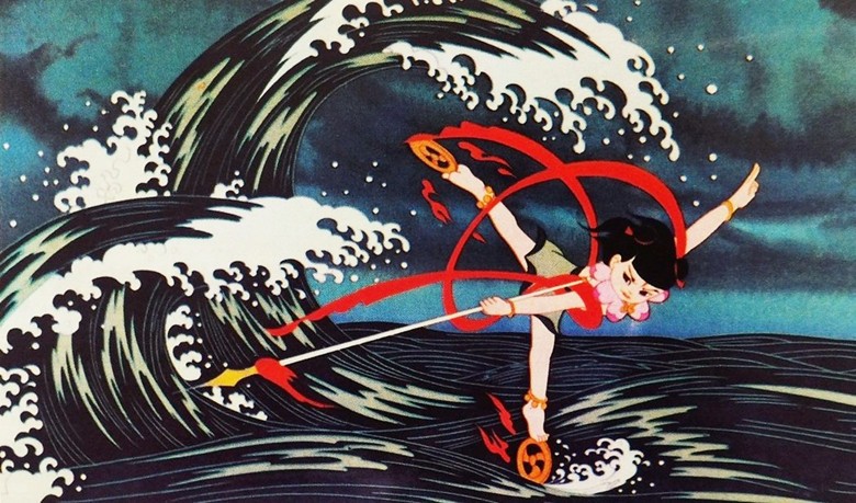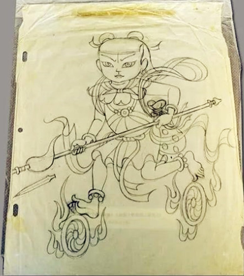 哪吒人物形象設計稿。圖自上海電影博物館 為了設計出符合劇本的人物形象,《哪吒鬧海》的美術總設計、著名畫家張仃參考了敦煌、永樂宮等壁畫以及大量的民間繪畫,并結合中國古代神話的內容,最終設計出一批符合故事風格的人物形象。哪吒的造型為“紅衣白褲、烏發赤足”,既保留傳統年畫的稚拙,又融入戲曲身段的飄逸。東海龍王的形象則借鑒了青銅器紋樣,龍鬚如虬枝盤曲,彰顯威嚴與腐朽并存的矛盾。