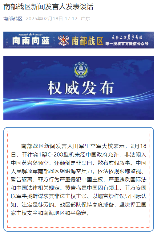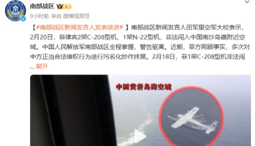 香港中通社2月18日電 據微信公眾號“南部戰區”消息,中國南部戰區新聞發言人田軍里空軍大校表示,2月18日,菲律賓1架C-208型飛機未經中國政府允許,非法闖入中國黃岩島領空,還顛倒是非黑白,散布虛假叙事。