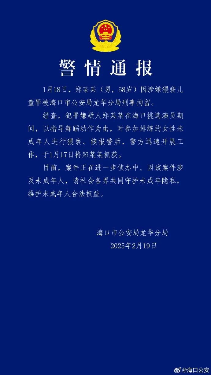 警情通報 圖源:海口公安 據公安通報,經查,犯罪嫌疑人鄭某某在海口挑選演員期間,以指導舞蹈動作為由,對參加排練的女性未成年人進行猥褻。接報警後,警方迅速開展工作,於1月17日將鄭某某抓獲。 目前,案件正在進一步偵辦中。 內地媒體“澎湃新聞”19日晚報道,據獲得的《拘留通知書》顯示,鄭某某名為鄭某峰,由海口市公安局龍華分局於今年1月18日簽發,鄭某峰因涉嫌猥褻兒童於當日19時被刑事拘留,其被羈押在海口市第一看守所。權威渠道人士告訴澎湃新聞,該《拘留通知書》是真實的。 公開資料顯示,鄭某峰是江西撫州市黎川縣人,集編劇、導演、演員、電影出品人、商人等多重身份於一身。撫州本地媒體2019年公開報道顯示,鄭某峰在電影《美人魚》中扮演的“鄭總”,被網友怒讚比主角還要出彩。鄭某峰時任香港HFIO資本管理公司董事長、金像影業董事長,同時還是一名電影出品人,曾參與多部電影的投資製作。天眼查工商註冊資料顯示,鄭某峰在海南投資的與影視、表演、藝術相關公司有5家。 《美人魚》是周星馳執導的喜劇愛情片,2016年上映。當年獲第36屆香港電影金像獎中包括最佳影片在內的八項提名。(完) 【編輯:彭玉婷】