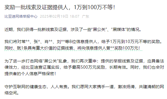 圖片來源:“比亞迪網絡舉報中心”微信公眾號截圖 據“比亞迪網絡舉報中心”微信公眾號消息,該公司將對8位信息提供人給予1萬元至10萬元不等的獎勵。公司同時也就一條具有重大價值的證據線索,將向曾姓信息提供人獎勵100萬元。 比亞迪稱:“為了進一步打擊網絡‘黑公關’亂象,我們再次重申:提供的舉報線索及證據,應具備法律效力,經比亞迪查證屬實後,給予最高500萬元獎勵,長期有效。”公司也承諾,會對提供者的個人信息嚴格保密。 去年6月19日,比亞迪品牌及公關處總經理李雲飛在社媒稱,某車企使用黑公關手段,對公司產品及品牌貶低、拉踩和惡意詆毀。因此公司向廣大網友及社會各界,徵集黑公關有效線索和證據,包括但不限於聊天記錄、錄音錄像、郵件、合同、費用支付等信息,只要能明確指向相關個人、黑公關廣告公司或有關車企,將整理上報至公安等相關部門,經查證屬實後,對有效線索及證據提供者予以獎勵。 據悉,這不是比亞迪第一次重金懸賞網絡黑公關。早在2021年12月,比亞迪就發起“清朗行動”,將獎勵金額確定為5萬元至100萬元。(完) 【編輯:林曉惠】
