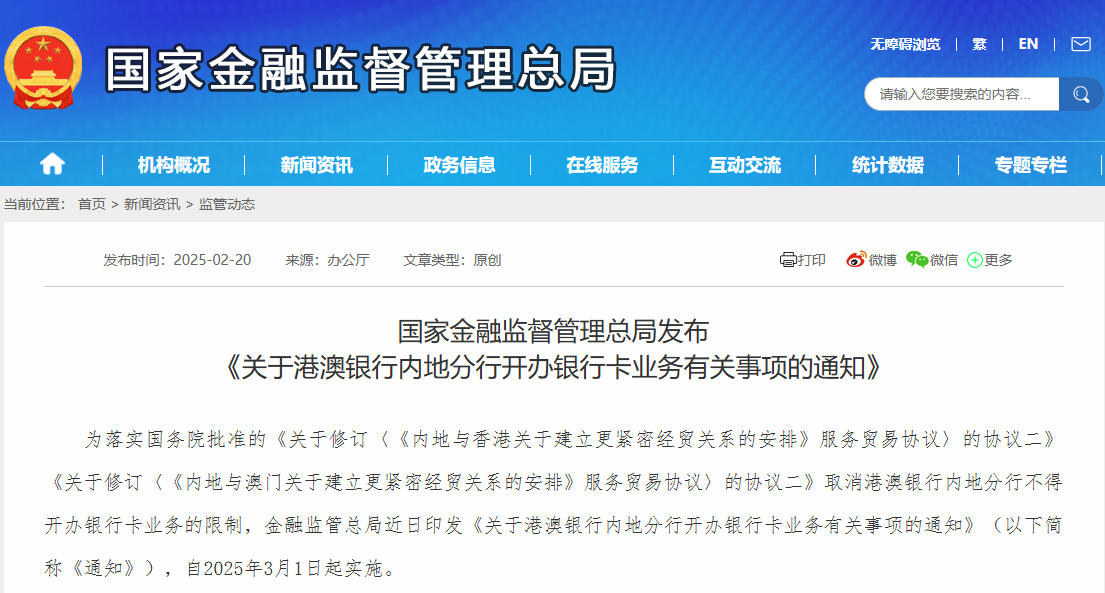 圖片來源:中國國家金融監督管理總局官網截圖 中國國家金融監督管理總局有關司局負責人介紹,《通知》適用的對象為香港特別行政區和澳門特別行政區的商業銀行依照內地有關法律、法規,經批准在內地設立的分行。《通知》允許港澳銀行內地分行在現有客戶對象範圍內開辦銀行卡業務,具體包括:對中國境外公民開辦外幣和人民幣銀行卡業務;對中國境內公民開辦外幣銀行卡業務;對中國境內、境外對公客戶(含企事業單位、政府機關等)開辦外幣和人民幣銀行卡業務。 此外,為強化管理行履行統籌管理職責,《通知》規定港澳銀行在內地設立多家分行的,如開辦銀行卡業務,原則上首先由管理行開辦,並明確了具體程序。同時,《通知》也考慮到管理行暫無計劃開辦銀行卡業務但其他分行有計劃開辦銀行卡業務的特殊情形,明確了具體程序。(完) 【編輯:林曉惠】