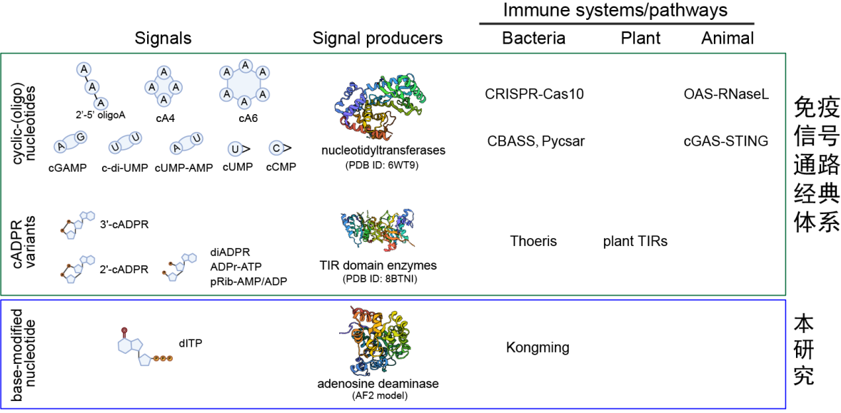 本研究(藍框)與經典免疫信號通路的比較 據央視新聞21日報道,微觀世界裡,細菌與病毒之間每天都在上演著攻防大戰。生物體內的信號傳遞如同精密的通信網絡,而核苷酸分子長期被認為是關鍵的“信號兵”。自1950年代發現環狀核苷酸(如cAMP、cGMP)以來,科學家已解析了其在代謝調節、免疫應答中的核心作用,相關研究多次獲得諾貝爾獎。不同於環狀核苷酸的免疫作用,非典型核苷酸在過去普通被認為不發揮任何生理作用。然而,研究團隊通過基因分析,鎖定了一個由KomA(孔明A)、KomB(孔明B)、KomC(孔明C)三個蛋白組成的防禦系統。當噬菌體入侵時,其攜帶的脫氧核苷酸激酶(DNK)意外成為激活細菌免疫的“開關”:KomA與DNK協作,將核苷酸(dAMP)轉化為特殊信號分子dITP。這種分子能觸發KomC蛋白分解細胞內的關鍵物質NAD ,導致噬菌體因“能源枯竭”無法複製。令人稱奇的是,該系統巧妙利用入侵者攜帶的酶完成防禦,正如三國時期諸葛亮“草船借箭”的智謀,因此被命名為“孔明系統”。這種碱基修飾核苷酸的信號傳導模式突破了環狀核苷酸作為信號分子的經典理論體系,首次證實非典型核苷酸同樣具有免疫調控功能。 研究顯示,“孔明系統”廣泛存在於各類細菌中,其模塊化結構(核心KomB-KomC搭配可變KomA)提示自然界可能存在更多未知的核苷酸信號系統。該發現不僅為細菌免疫研究提供新方向,其特異性識別dITP的特性更具備醫學應用潛力:未來或可開發便攜式核苷酸檢測工具,助力遺傳代謝病(如ADA缺乏症)診斷及抗癌藥物療效監測,突破現有檢測技術依賴大型儀器的局限。(完) 【編輯:彭玉婷】