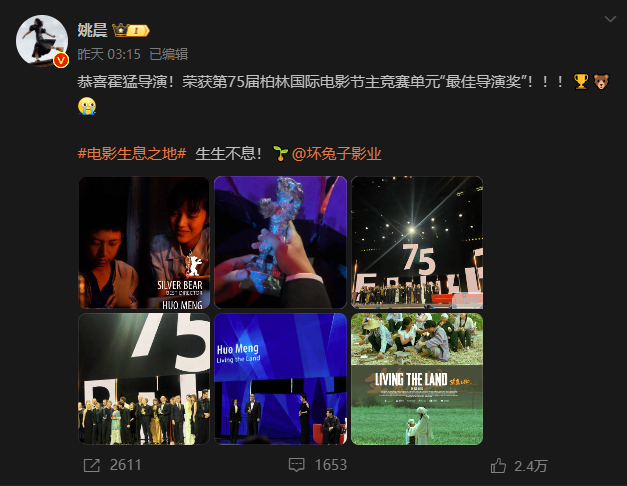 演員姚晨微博截圖 影片聚焦20世紀90年代中國鄉村城市化進程,以一名10歲留守兒童的視角,呈現傳統宗族文化與現代化衝擊的複雜張力。劇情核心圍繞“鄉村大家庭撫養與城市打工父母的疏離”展開,被評為“一部充滿詩意與社會關懷的時代寓言”。 評委會頒獎詞強調,該片“以細膩的影像語言與克制的敘事節奏,揭示了鄉村變革中個體的溫暖、掙扎與羈絆。鏡頭下光明與陰影的交織,令觀眾深陷其中難以抽離”。 公開資料顯示,霍猛於1984年生於河南省周口市太康縣,畢業於中國傳媒大學法學專業,2018年憑處女作《過昭關》橫掃三大獎項:第2屆平遙國際電影展費穆榮譽·最佳導演獎、第22屆上海國際電影節電影頻道傳媒大獎最受關注導演、第11屆中國電影導演協會年度青年導演獎。 該片由演員姚晨擔任監製及出品人,其丈夫知名攝影師曹郁(代表作《妖貓傳》《南京!南京!》)出任總策劃,製作方為兩人共同創立的壞兔子(上海)影業有限公司。姚晨,1979年生於福建省福州市,成長於南平市,代表作有情景喜劇《武林外傳》、諜戰劇《潛伏》、律政劇《離婚律師》。2010年以“微博女王”稱號成為初代社交媒體頂流。 此為霍猛作品首度入圍歐洲三大電影節主競賽,亦標誌着壞兔子影業從演員驅動型公司向作者電影製片方的轉型突破。(完) 【編輯:彭玉婷】