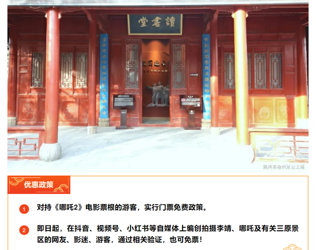 圖源:咸陽文旅 湖南 2月18日,張家界國家森林公園發佈消息,凡觀看《哪吒2》的遊客,購買一次張家界國家森林公園景區大門票,可在年內免費無限次進入張家界國家森林公園遊覽。 湖北 2月14日,湖北恩施梭布埡石林景區宣佈:2月28日前,遊客憑紙質版《哪吒2》電影票根+購票記錄,可免恩施梭布埡石林景區大門票(價值78元);3月10日前,憑紙質版《哪吒2》電影票根+購票記錄,預訂以下酒店民宿:恩施奧山雅閣酒店、大隱泊森酒店、畔山雲隱民宿、石海別院民宿,享酒店掛牌價立減優惠:每張票根抵扣50元房費(單房最高使用2張),須在入住時出示票根核銷。 山東 青島海信探索中心:持電影票根入館遊玩,享受門票5折優惠! 淄博魯山森林公園:截至2月28日,持電影票根(電子紙質均可),到魯山國家森林公園北門售票處檢票口核驗後即可免門票入園。(包含項目:觀雲峰、棗樹峪、松雲湖、駝禪寺、嬉雪樂園) 煙台龍口南山景區:截至2月28日,持電影票根(電子、紙質均可),到龍口南山景區檢票廣場購票,享有景區門票半價60元特權(半價票不包含夜場活動)。 泰安新甫山:截至2月28日,憑本人身份證和電影票或相關購票信息(無論是電子版還是紙質版均可),即可前往新甫山售票處兌換免費門票一張。 臨沂沂蒙山龜蒙景區、沂蒙山雲蒙景區:截至2月28日,遊客持票根至景區售票窗口核驗後,兌換免費紙質門票1張,憑兌換紙質門票至景區檢票口檢票入園。 河南 據河南老界嶺景區消息,2月28日前,遊客憑紙質版《哪吒2》電影票根或手機電子憑證,可免老界嶺景區門票。 老界嶺景區所處的西峽縣,被讚譽為“哪吒故里”和“哪吒文化發祥地”。這裡有著許多與哪吒相關的傳說,充滿了神秘色彩和獨特魅力。 甘肅蘭州 2月20日起,凡觀看《哪吒2》的遊客,憑購票信息(電子或紙質票根)及本人身份證等有效身份證件,即可享受蘭州水墨丹霞旅遊景區門票“買一贈一”優惠(贈票有效期至2025年4月30日)。 黑龍江 截至3月31日,憑《哪吒2》電影票根,即可享受一元暢游黑瞎子島的超值優惠。 黑瞎子島,位於中國最東端,是祖國第一縷陽光升起的地方。在這裡,可以漫步濕地棧道,呼吸純淨空氣,與自然親密接觸;偶遇珍稀鳥類和野生動物,感受生態之美;還有東極寶塔、界碑等景點,隨手一拍就是大片。(完) 【編輯:石歡歡】