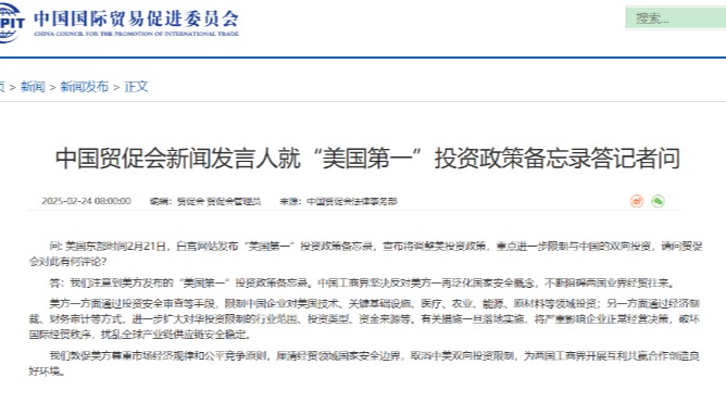 香港新聞網2月24日電 針對白宮網站2月21日發佈投資政策備忘錄重點進一步限制與中國的雙向投資,中國外交部發言人林劍24日在例行記者會上答問時表示,美方發佈的有關備忘錄以國家安全為由將中國列為外國對手,採取各種歧視性舉措強化對華雙向投資限制,中方對此強烈不滿、堅決反對,已向美方提出嚴正交涉。