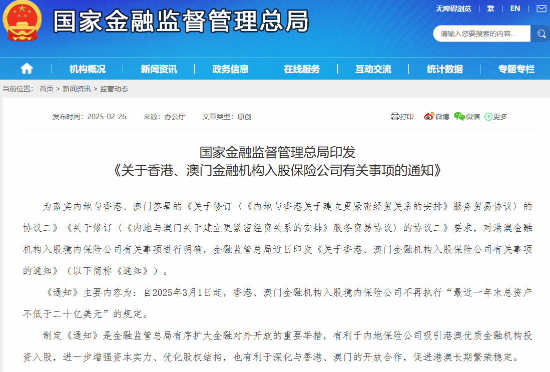 香港中通社2月26日電 據中國國家金融監督管理總局網站26日消息,該局近日印發《關於香港、澳門金融機構入股保險公司有關事項的通知》,其主要內容為:自3月1日起,香港、澳門金融機構入股境內保險公司不再執行“最近一年末總資產不低於二十億美元”的規定。