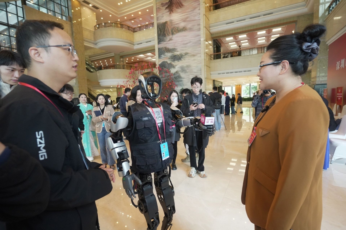 人形機器人“誇父”採訪代表委員。深圳晚報圖片 除了人形機器人“記者”外,全國首個政務級AI大模型同聲傳譯軟件 ——InnAIO也驚艶亮相深圳兩會,為外國領事官員提供實時翻譯服務。該軟件具備0.5秒級響應速度,政策術語翻譯準確率高達98.6%,憑藉出色表現贏得了外國領事的點讚。 同時,應用了AI算法的外骨骼機器人也在兩會現場大顯身手。新聞攝像記者佩戴的A10手臂助力外骨骼機器人,能够輕鬆扛起40斤的設備,有效減輕了拍攝負擔。該技術已逐步延伸至醫療康複、應急救援等領域,為更多行業帶來變革。 在政府工作報告中,深圳明確提出深化“千行百業+AI”應用,推出100個垂直示範場景,加速推動人工智能與實體經濟深度融合。