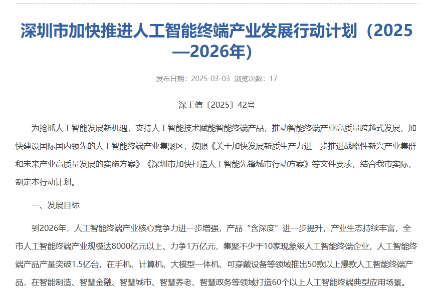 中國深圳市工業和信息化局網站截圖 據《行動計劃》提出的發展目標,到2026年,人工智能終端產業核心競爭力進一步增強,產品“含深度”進一步提升,產業生態持續豐富,深圳市人工智能終端產業規模達8000億元以上、力爭1萬億元,集聚不少於10家現象級人工智能終端企業,人工智能終端產品產量突破1.5億台,在手機、計算機、大模型一體機、可穿戴設備等領域推出50款以上爆款人工智能終端產品,在智能製造、智慧金融、智慧城市、智慧養老、智慧政務等領域打造60個以上人工智能終端典型應用場景。 《行動計劃》提出九大重點品類,分別是人工智能手機、人工智能計算機(含台式電腦、筆記本電腦)、人工智能平板電腦、大模型一體機、人工智能可穿戴設備、人工智能影像設備、全屋智能產品、工業級人工智能終端以及其他新型人工智能終端。(完) 【編輯:彭玉婷】