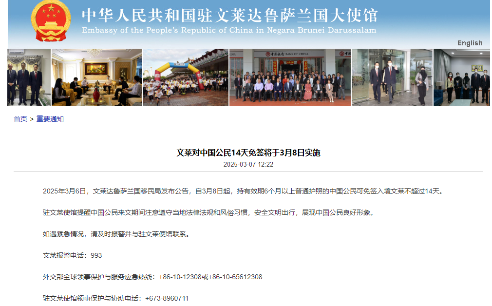 香港中通社3月7日電 據中國駐文萊使館微信公眾號3月7日消息,3月6日,文萊達魯薩蘭國移民局發布公告,自3月8日起,持有效期6個月以上普通護照的中國公民可免簽入境文萊不超過14天。