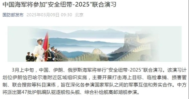中國海軍艦艇編隊抵達恰巴哈爾港附近海域 圖源:“人民海軍”微信公眾號 伊朗半官方的通訊社塔斯尼姆(Tasnim)當地時間9日報道,演習“將於11日在伊朗東南部阿曼灣的恰巴哈爾港開始”,旨在“加強該地區的安全,擴大參與國之間的多邊合作”,但沒有具體說明演習持續時間。 報道又稱,“中國和俄羅斯海軍的軍艦、戰鬥艦與支援艦,以及伊朗海軍和革命衛隊的軍艦”預計將參加演習。 俄羅斯國防部同日發聲明說,莫斯科將派出兩艘護衛艦和一艘太平洋艦隊參加演習。“在印度洋北部的幾天裡,船員們將執行解救被俘船隻、海上搜救,以及向海上和空中目標進行炮擊的任務。” 中國國防部官方微信9日發文說,“中方將派出第47批護航編隊驅逐艦包頭艦、綜合補給艦高郵湖艦參演”。 此外,阿塞拜疆、南非、阿曼、哈薩克斯坦、巴基斯坦、卡塔爾、伊拉克、阿拉伯聯合酋長國和斯里蘭卡將作為觀察員出席演習。 伊朗軍隊於2月在同一地區進行演習,以“加強對任何威脅的防禦能力”。(完) 【編輯:彭玉婷】