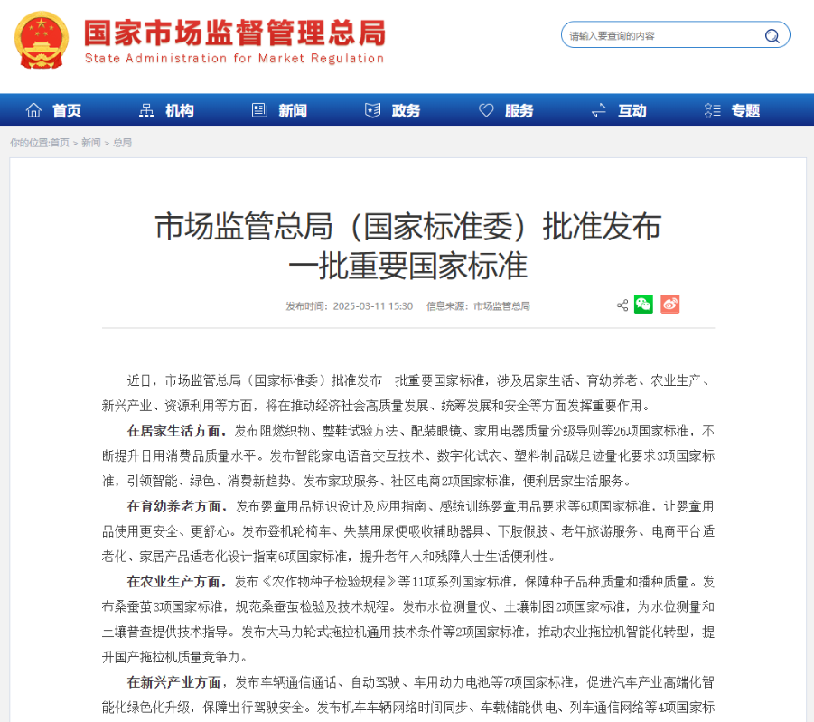 中國國家市場監管總局官網截圖 據介紹,在新興產業方面,中國國家市場監管總局(國家標準委)批准發布車輛通信通話、自動駕駛、車用動力電池等7項國家標準,促進汽車產業高端化智能化綠色化升級,保障出行駕駛安全。發布機車車輛網絡時間同步、車載儲能供電、列車通信網絡等4項國家標準,保障軌道交通系統安全穩定運行。 此外,中國國家市場監管總局(國家標準委)近日還批准發布了居家生活、育幼養老、農業生產、資源利用等方面的國家標準。(完) 【編輯:彭玉婷】