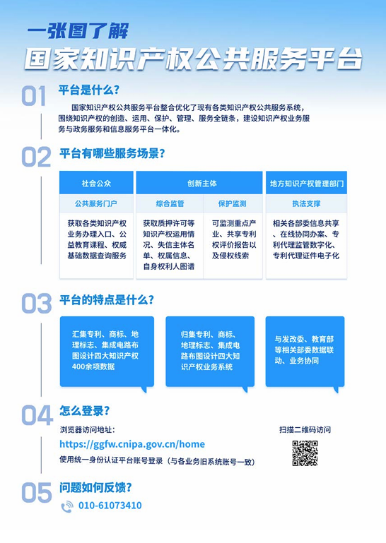 香港新聞網3月12日電 據中國國家知識產權局辦公室消息:為提升知識產權公共服務數字化、智能化和便利化水平,國家知識產權局完成國家知識產權保護信息平台項目建設,將國家知識產權公共服務網升級改造為國家知識產權公共服務平台,於3月10日正式上線。