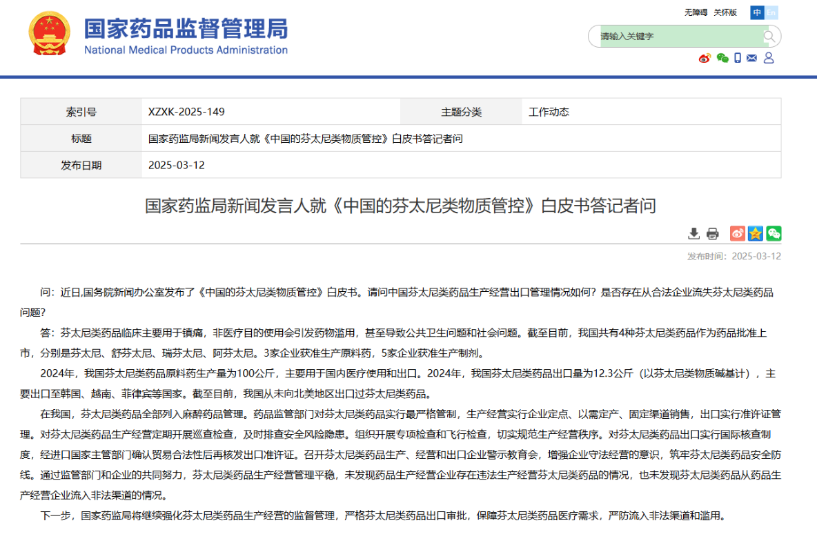 中國國家藥監局官網截圖 有記者問,近日,中國國務院新聞辦公室發佈了《中國的芬太尼類物質管控》白皮書。請問中國芬太尼類藥品生產經營出口管理情況如何?是否存在從合法企業流失芬太尼類藥品問題?中國國家藥監局新聞發言人作出上述回應。 發言人表示,在中國,芬太尼類藥品全部列入麻醉藥品管理。藥品監管部門對芬太尼類藥品實行最嚴格管制,生產經營實行企業定點、以需定產、固定渠道銷售,出口實行準許證管理。對芬太尼類藥品生產經營定期開展巡查檢查,及時排查安全風險隱患。組織開展專項檢查和飛行檢查,切實規範生產經營秩序。對芬太尼類藥品出口實行國際核查制度,經進口國家主管部門確認貿易合法性後再核發出口準許證。召開芬太尼類藥品生產、經營和出口企業警示教育會,增強企業守法經營的意識,築牢芬太尼類藥品安全防線。通過監管部門和企業的共同努力,芬太尼類藥品生產經營管理平穩,未發現藥品生產經營企業存在違法生產經營芬太尼類藥品的情況,也未發現芬太尼類藥品從藥品生產經營企業流入非法渠道的情況。 發言人說,下一步,國家藥監局將繼續強化芬太尼類藥品生產經營的監督管理,嚴格芬太尼類藥品出口審批,保障芬太尼類藥品醫療需求,嚴防流入非法渠道和濫用。(完) 【編輯:彭玉婷】