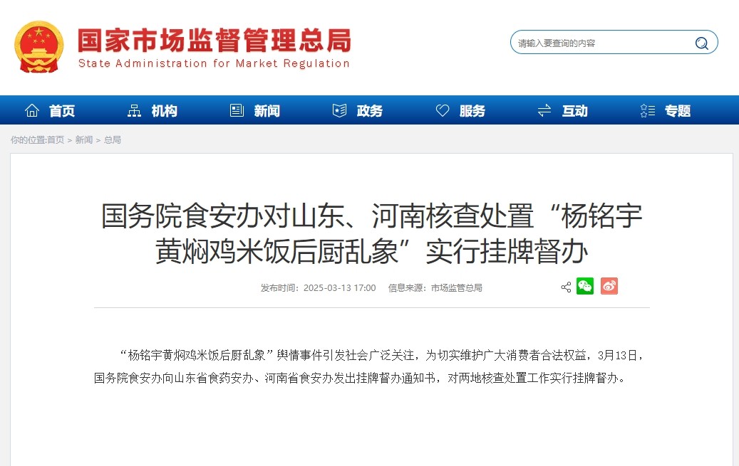 中國國家市場監督管理總局官網截圖 近日,有媒體曝光多家楊銘宇黃燜雞米飯加盟店後廚食品安全問題,包括使用存放多天的發酸食材,顧客食用後的剩菜回收再加工售賣,隔夜發黑的牛肉加色素後冒充新鮮牛肉。調查中還發現,多家門店招聘時不需要員工提供健康證,大量無證店員直接上崗。 3月12日,楊銘宇公司通過官方微博發布了致歉信稱,對旗下涉事加盟門店(鄭州二七萬達店、鄭州康復前街店、商丘萬鼎廣場店)出現的食品安全問題向廣大消費者表示最深切的歉意,立即關閉並永久停業3家涉事加盟門店。此外,還將對全體員工重新開展食品安全培訓,並要求必須通過考核才能繼續上崗工作,以提升全員的食品安全意識和服務水平等。 另一方面,多名外賣小哥在網上分享“最不能點的外賣”、“外賣員從來不碰的外賣有哪些”等話題登上熱搜。據“南方日報”微信公眾號稱,來自外賣行業一手的“反向推薦”,涵蓋了黃燜雞、炸雞、麻辣燙、料理包快餐等12類常見外賣,幾乎將都市人的日常飲食一網打盡,既是一面照見行業病灶的鏡子,也是一場關於食品安全監管缺失的反思。 舉例來說,商家將預製菜在熱水中泡熱後澆在米飯上,全程甚至無需開火,成本低至3元人民幣一包。這種工業流水線產物,冠以“效率”之名,卻存在添加劑過量、食材來源不明等隱患,消費者以為的“熱氣騰騰”,不過是“溫水泡飯”。(完) 【編輯:彭玉婷】