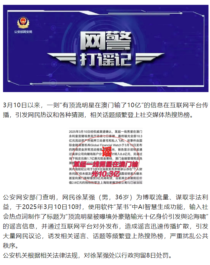 圖源:“公安部網安局”微信公眾號 中國公安網安部門查明,網民徐某強(男,36歲)為博取流量、謀取非法利益,於10日10時,使用軟件“某書”中AI智慧生成功能,輸入社會熱點詞製作了標題為“頂流明星被曝境外豪賭輸光十億身價引發輿論海嘯”的謠言信息,並通過互聯網平台對外發布,造成謠言迅速傳播擴散,引發大量網民議論,誘發相關謠言、話題等頻繁登上熱搜熱榜,嚴重擾亂公共秩序。 中國公安機關根據相關法律法規,對徐某強處以行政拘留8日處罰。 此前上述謠言流傳之時,有網友猜測當事人為知名藝人周杰倫、黃曉明等。周杰伦公司、黃曉明本人紛紛在線闢謠。(完) 【編輯:彭玉婷】