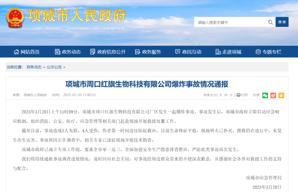 香港中通社3月20日電 據河南項城市人民政府網站消息,河南項城市應急管理局20日下午發布情況通報:3月20日上午11時09分,項城市周口紅旗生物科技有限公司廠區發生一起爆炸事故。事故發生後,項城市政府立即啟動應急響應機制,組織消防、公安、醫療、應急管理等相關部門趕赴現場開展救援處置工作。