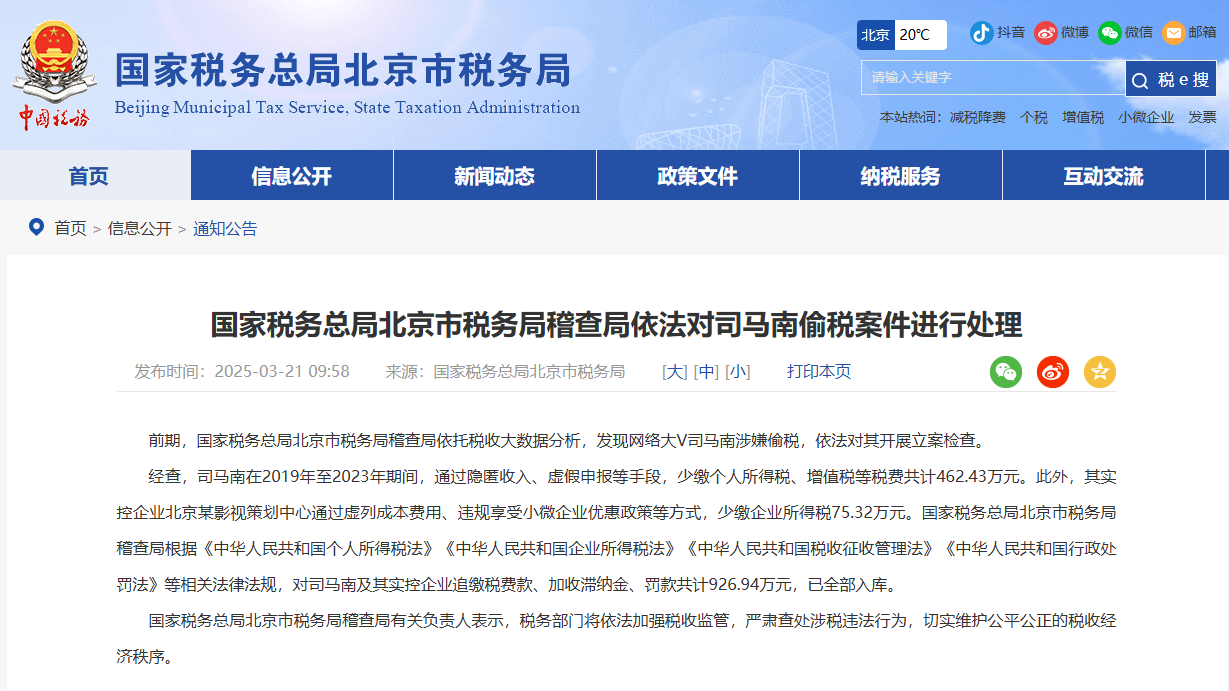 中國國家稅務總局北京市稅務局21日公布網絡“大V”司馬南偷稅案件處理情況 據介紹,前期,中國國家稅務總局北京市稅務局稽查局依託稅收大數據分析,發現司馬南涉嫌偷稅,依法對其開展立案檢查。 經查,司馬南在2019年至2023年期間,通過隱匿收入、虛假申報等手段,少繳個人所得稅、增值稅等稅費共計462.43萬元。 此外,其實控企業北京某影視策劃中心通過虛列成本費用、違規享受小微企業優惠政策等方式,少繳企業所得稅75.32萬元。 中國國家稅務總局北京市稅務局稽查局根據相關法律法規,對司馬南及其實控企業追繳稅費款、加收滯納金、罰款共計926.94萬元,已全部入庫。 公開資料顯示,司馬南本名于力,1956年生,黑龍江人,是一名獨立學者、社會評論家,全網粉絲超5000萬。1990年代,因反偽科學和揭露偽氣功、假神醫聞名,此後活躍於政治評論領域。 從去年11月初起,司馬南微博、抖音等平台賬號已停止更新。天眼查顯示,目前司馬南關聯有6家公司,其中僅有2家狀態為存續。(完) 【編輯:彭玉婷】