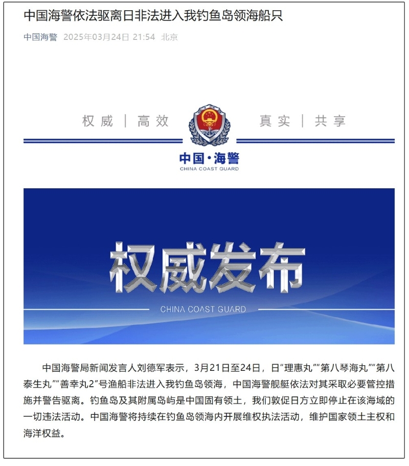 香港新聞網3月25日電 中國海警局新聞發言人劉德軍表示,3月21日至24日,日“理惠丸”“第八琴海丸”“第八泰生丸”“善幸丸2”號漁船非法進入中國釣魚島領海,中國海警艦艇依法對其採取必要管控措施並警告驅離。 劉德軍指出,釣魚島及其附屬島嶼是中國固有領土,我們敦促日方立即停止在該海域的一切違法活動。中國海警將持續在釣魚島領海內開展維權執法活動,維護國家領土主權和海洋權益。