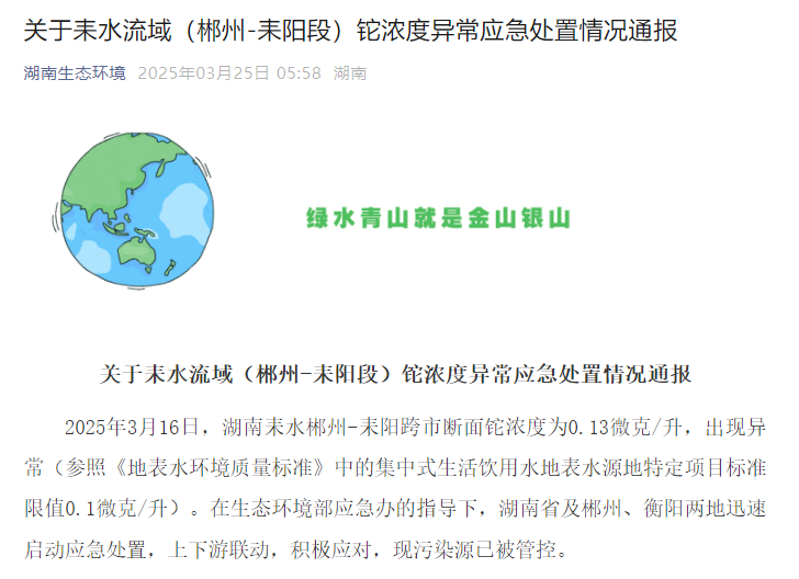 湖南通報耒水流域現鉈濃度異常:污染源已管控 供水安全未受影響分享到: