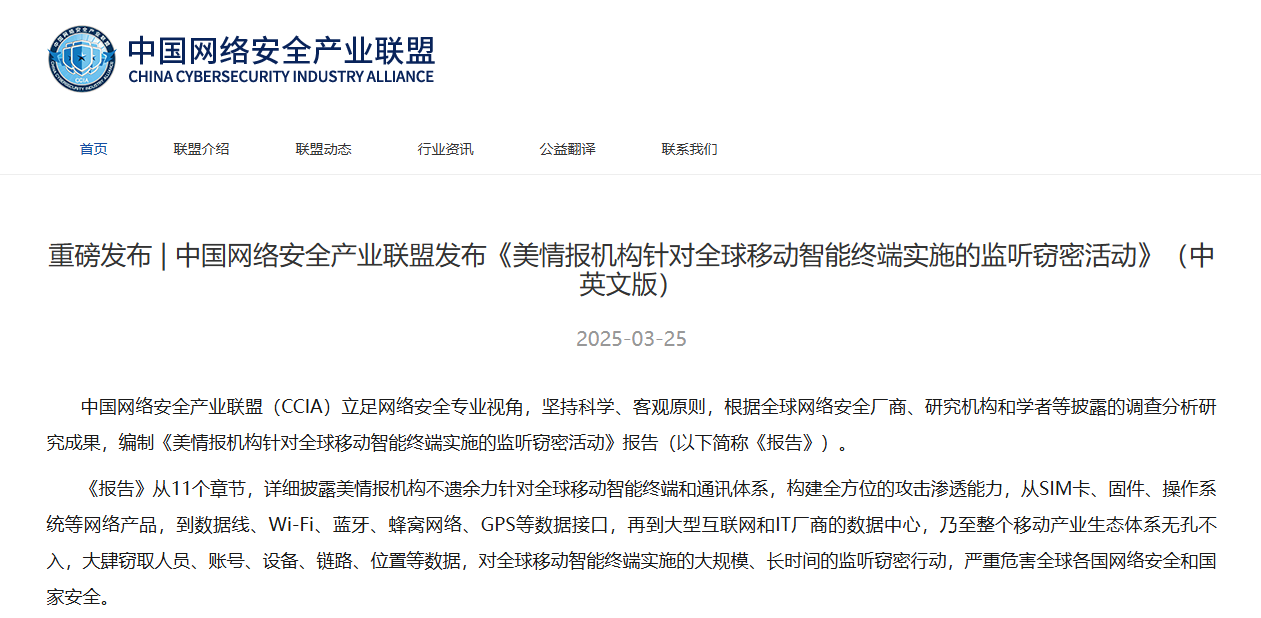 中國網絡安全產業聯盟(CCIA)25日發布了報告 該份報告名為《美情報機構針對全球移動智能終端實施的監聽竊密活動》。據介紹,報告匯集了來自中國及全球的安全研究者、學術界以及國際安全企業的研究成果,展示了美方在全球範圍內開展的複雜網絡攻擊策略。這些攻擊不僅瞄準政府官員和技術專家等高價值目標,也涉及普通民眾,凸顯了這一威脅的普遍性和嚴重性。 報告共分11個章節,全面分析了美國情報機構在SIM卡、手機操作系統、APP應用等多個層面的攻擊手法。報告指,通過利用這些漏洞,美方可以實現跨品牌和系統的攻擊,通過供應鏈前置攻擊獲取加密密鑰,進一步加劇了安全威脅。 其中,“量子系統”被用來攻擊包括手機和PC在內的上網設備,而“零點擊”攻擊則能夠在用戶無任何操作的情況下植入惡意軟件,極大地提高了攻擊的成功率。 報告又提到了蘋果iOS平台上的iMessage服務也成為攻擊目標之一,這表明即便是高端智能手機也不免受到此類攻擊的影響。同時,通過使用商業間諜軟件如以色列的“飛馬”,美方實現了對多個國家元首及政要的監控。 中國網絡安全產業聯盟理事長肖新光呼籲,全球的研究者、學者和安全從業者共同努力,增強公眾對網絡安全威脅的認識,並採取有效措施保護個人隱私和國家安全。(完) 【編輯:彭玉婷】