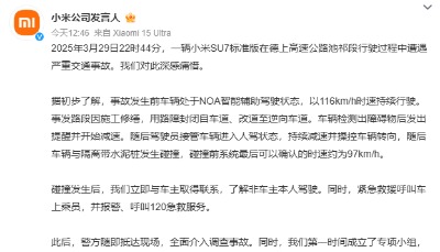 資料圖為雷軍。香港中通社圖片 雷軍表示,因事故仍在調查,諸多問題暫時無法解答,但小米不會迴避,將盡力回應家屬和社會關切。 事故在4月1日持續發酵,由於事故車輛在碰撞前處於智能輔助駕駛狀態,輿論也開始討論智能駕駛的安全性問題。網民質疑雷軍在事件後持續沉默。小米集團股價直線跳水。截至周二港股收盤,股價大跌5.49%。 有分析文章指,部分車型已經具備一定的自動駕駛能力,大大提高了駕駛的安全性和舒適性。但是,智駕是否如宣傳的那麼可靠值得探究。 文章指出,一些關於智能駕駛的宣傳中,使用“零接管”、“自動駕駛”,模糊了輔助駕駛與自動駕駛的本質界限,過度拔高智能輔助駕駛的安全性,忽視用戶教育。“現階段,智駕只是輔助駕駛,人仍然是責任主體。” 3月29日晚,一輛小米SU7在高速路上發生碰撞後爆燃,3人死亡。死者家屬提出車輛“突然失控”、“事故後車門鎖死”等質疑。車輛碰撞前,處於智能輔助駕駛狀態,行駛速度約每小時116公里。(完) 【編輯:彭玉婷】