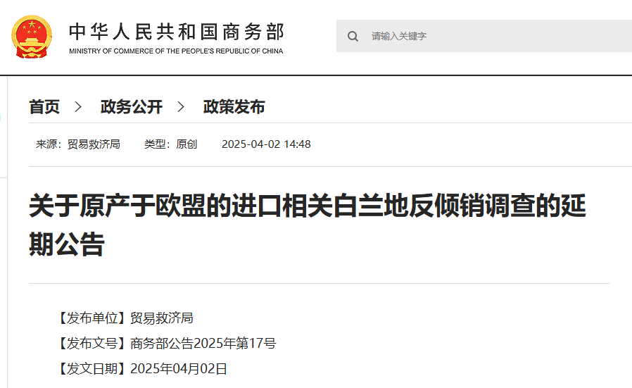 香港新聞網4月2日電 中國商務部4月2日發佈《關於原產於歐盟的進口相關白蘭地反傾銷調查的延期公告》:根據《中華人民共和國反傾銷條例》的規定,2024年1月5日,商務部發佈2024年第1號公告,決定對原產於歐盟的進口相關白蘭地進行反傾銷立案調查。2024年12月25日,商務部發佈2024年第59號公告,決定將本案調查期限延長至2025年4月5日。 鑒於本案情況複雜,根據《中華人民共和國反傾銷條例》第二十六條的規定,商務部決定將本案的調查期限延長至2025年7月5日。(完)