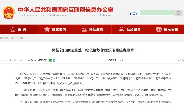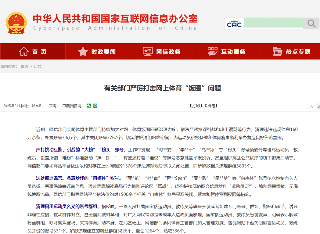圖源:中國互聯網信息辦公室官網截圖 具體來說,工作中嚴打挑動互撕、引戰的“大粉”“粉頭”賬號;懲處編造謠言、惡意炒作的“自媒體”賬號;清理冒用運動員名義的賬號群組;查處一批違規售賣涉運動員商品的商家店舖;及時處置存在不良導向的產品功能;強化線上線下聯動處置工作。 近年來,不良“飯圈文化”有大舉侵入中國體育領域的趨勢。在一些賽事中,不同球員的粉絲群體從網上對陣發展為現場“互嗆”,有的甚至在比賽現場對球員進行惡意干擾。 今年1月,中國國家體育總局召開專題會議,明確要把“飯圈”亂象治理作為當前緊迫任務抓緊抓實。3月全國兩會期間,整治體育界畸形“飯圈”成為熱點話題。中國國家體育總局局長高志丹3月11日在十四屆全國人大三次會議第三場“部長通道”集中採訪活動上表示,要堅決抵制“飯圈文化”對體育的侵蝕和破壞。(完) 【編輯:彭玉婷】