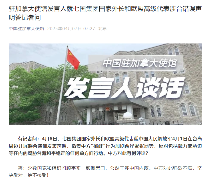 “中國駐加拿大使館”微信公眾號截圖 中國駐加拿大使館發言人當天說,台灣問題純屬中國內政,不容外來干涉。破壞台海和平穩定的是“台獨”分裂活動和外部勢力縱容支持。中方開展聯合演訓,正是對賴清德當局猖狂謀“獨”挑釁的堅決懲戒,是對“台獨”分裂勢力蓄意破壞台海和平的嚴正警告,是捍衛國家主權、安全和領土完整的負責任之舉,任何外部勢力無權對此說三道四。我們決不允許任何人、任何勢力以任何方式將台灣從中國分裂出去,將採取一切必要措施,堅定捍衛國家主權和領土完整。 發言人說,中方敦促有關國家和組織順應國際社會堅持一個中國原則的大勢,恪守對中方所作政治承諾,立即停止在台灣問題上干涉中國內政。(完) 【編輯:彭玉婷】
