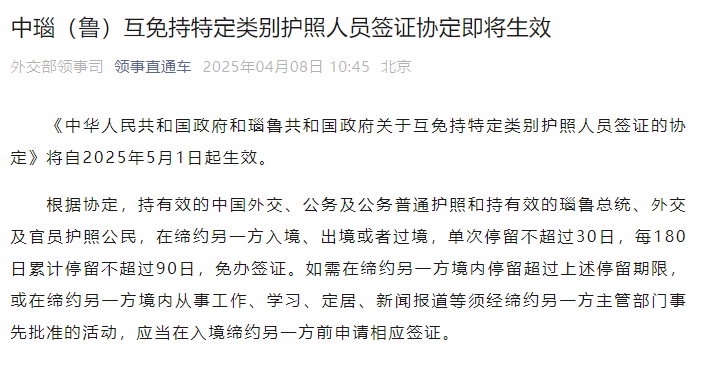 香港中通社4月8日電 據中國外交部領事司8日消息,《中華人民共和國政府和瑙魯共和國政府關於互免持特定類別護照人員簽證的協定》將自5月1日起生效。